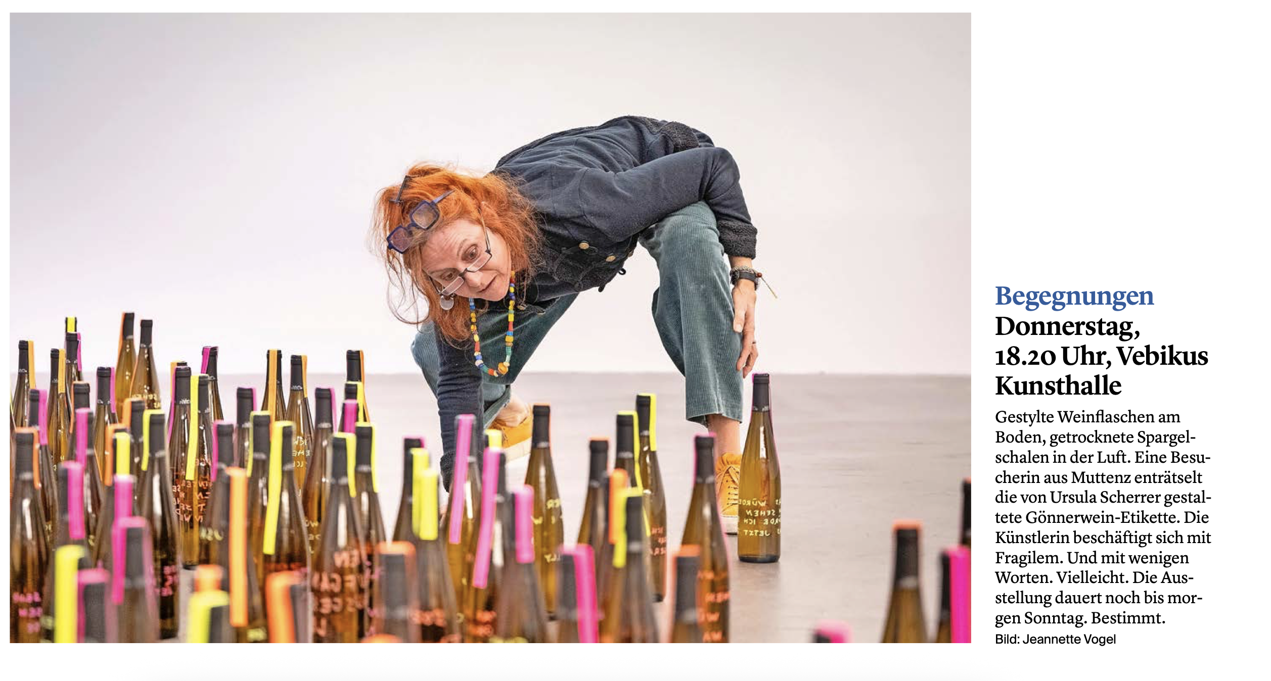 Nebst dem Kunst-Wein wird Ursula Scherrer auch einige ihrer fotografischen Arbeiten sowie zwei Performances zeigen. Kommen Sie vorbei, bringen Sie Freunde, Bekannte und Kunstinteressierte mit, wählen Sie ihre Weinflasche aus und geniessen Sie einen Apéro! Die Künstlerin ist anwesend. Eine Anmeldung ist nicht nötig. Wer an Ort und Stelle Gönner:in wird, kann ebenfalls eine Flasche mitnehmen.